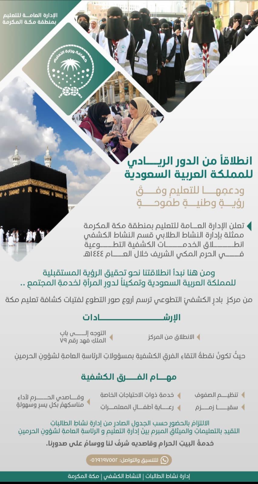 أطلقت الإدارة العامة للتعليم بمنطقة مكة المكرمة ممثلة في إدارة نشاط الطالبات الفرق الكشفية بمدارس تعليم مكة المكرمة يوم الجمعة الموافق 13 / 7 / 1444هـ، وذلك من خلال تقديم الخدمات الكشفية التطوعية داخل الحرم المكي بعدة مسارات من مساندة الرئاسة العامة لشؤون الحرمين ومساندة قوى الأمن بتنظيم المصليات النسائية  وخدمة كبار السن وذوي الإعاقة.