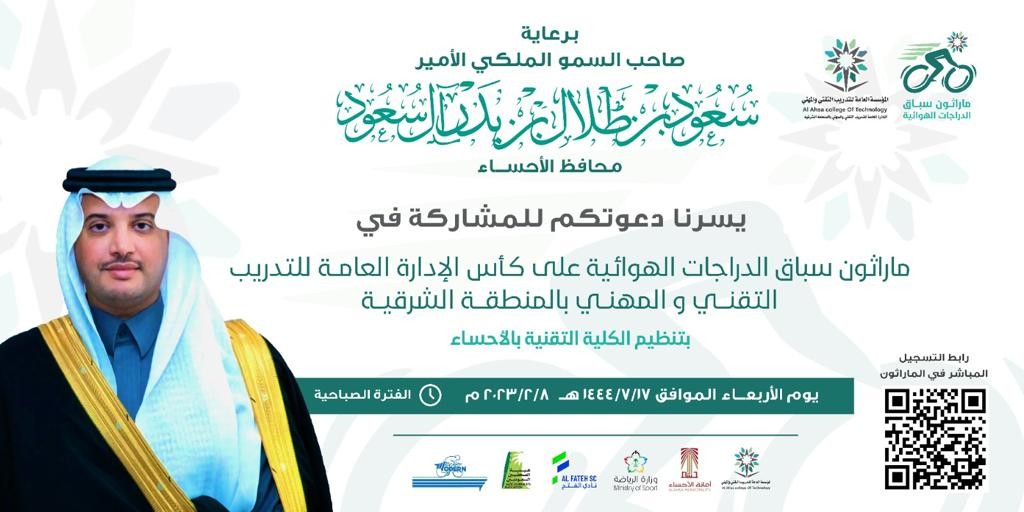 يرعى صاحب السمو الملكي الأمير سعود بن طلال بن بدر محافظ الأحساء صباح يوم الأربعاء 17 رجب 1444هـ (ماراثون سباق الدراجات الهوائية) وبحضور معالي محافظ المؤسسة العامة للتدريب التقني والمهني الدكتور أحمد بن فهد الفهيد، والذي تطلقه الإدارة العامة للتدريب التقني والمهني بالمنطقة الشرقية وبتنظيم الكلية التقنية بالأحساء .