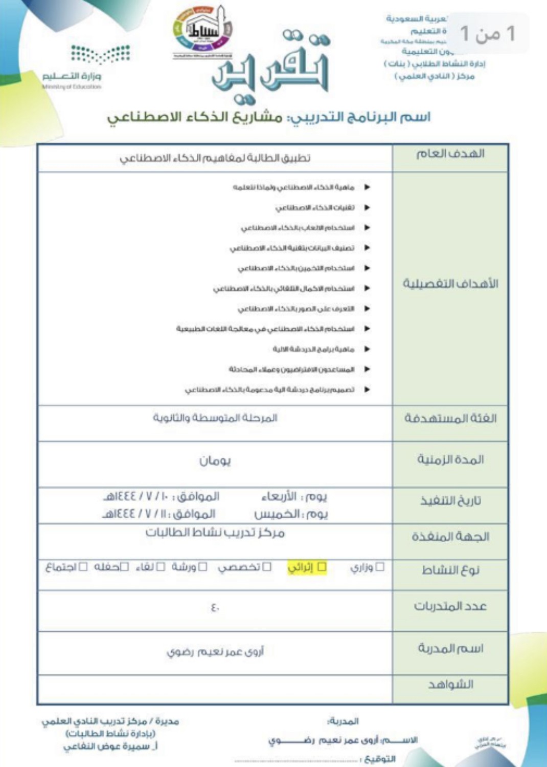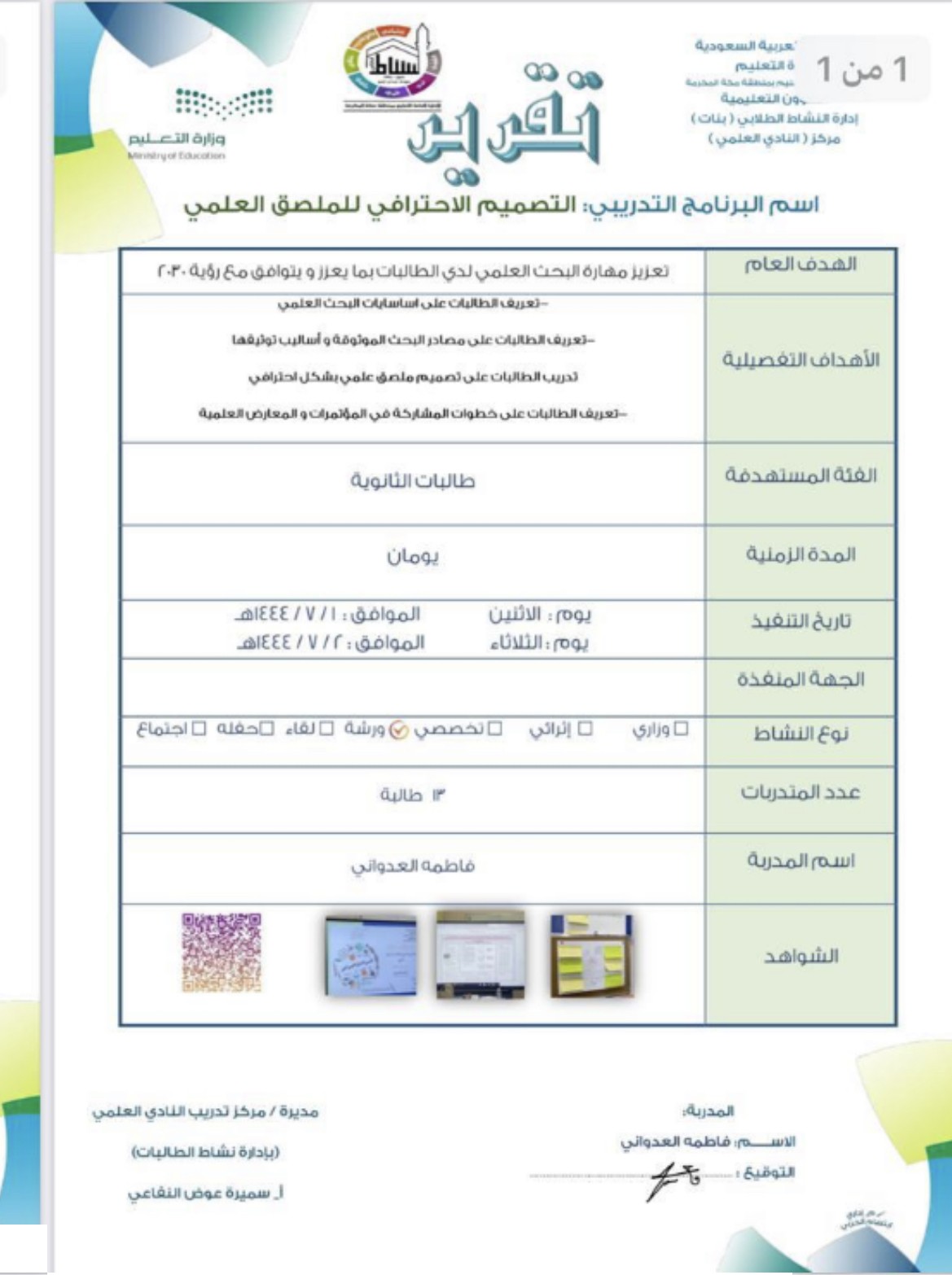 من منطلق أهمية تدريب ورعاية وتطوير قدرات ومهارات الموهوبين والمبدعين في مجالات العلوم والتقنية، وحرصا على تجويد مشاركات الطالبات في الأنشطة اللاصفية والمشاريع الوزارية ، نفذت إدارة نشاط الطالبات ممثلة بمركز تدريب النادي العلمي عدة برامج تدريبية خلال الفصل الدراسي الثاني لعام 1444هـ