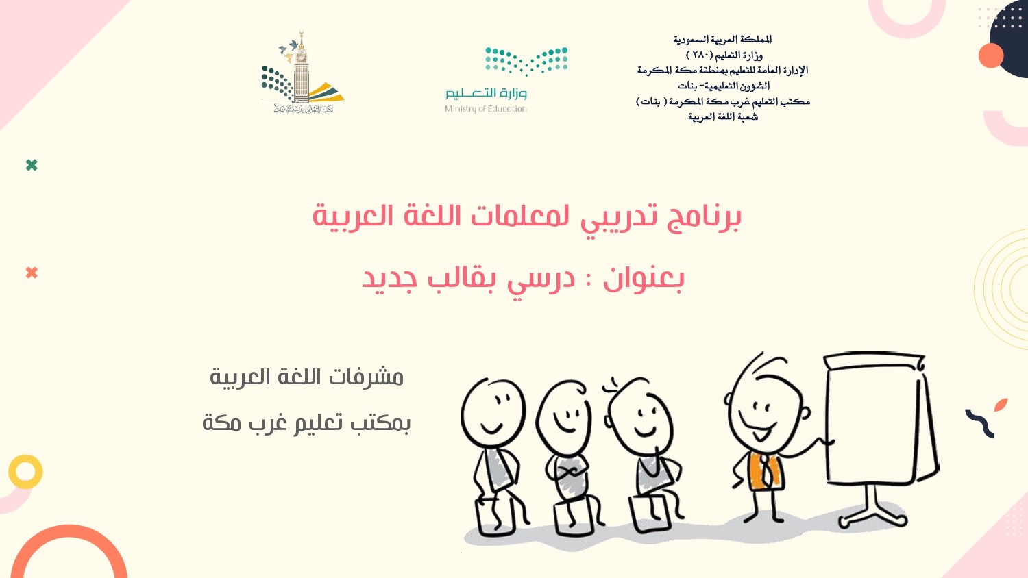 نفذت الإدارة العامة للتعليم بمنطقة مكة المكرمة ممثلة بمكتب تعليم غرب مكة -شعبة اللغة العربية- يومي الأربعاء والخميس 17-18/7/1444هـ في قاعة التدريب بمكتب التعليم برنامجا تدريبيا بعنوان: درسي بقالب جديد.