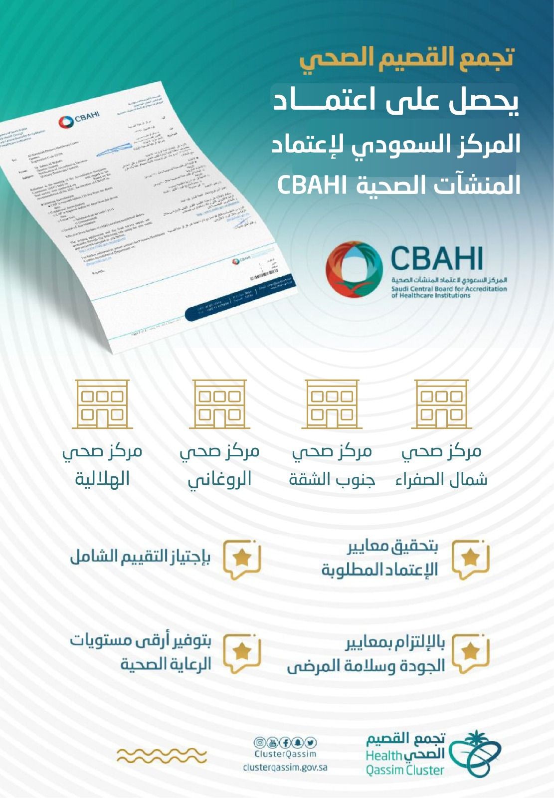 وأكد تجمع القصيم الصحي أن المراكز الصحية المعتمدة نجحت وبصورة متميزة في اجتياز كافة الاشتراطات التي وضعها "سباهي CBAHI "، مما يشير إلى مدى الالتزام بتطبيق أعلى معايير الجودة وأفضل نظم السلامة في توفير الخدمات العلاجية المقدمة والرعاية للمستفيدين وتفعيل مستوياتها بما يتماشى مع المتطلبات الدولية، ويعزز في الوقت ذاته ثقة المرضى بنوعية وجودة الخدمات المقدمة تماشيا مع برنامج التحول الصحي ومستهدفات رؤية المملكة 2030، ووصولاً لتحقيق الطموحات والتطلعات المنشودة في بناء مجتمع حيوي مزدهر.