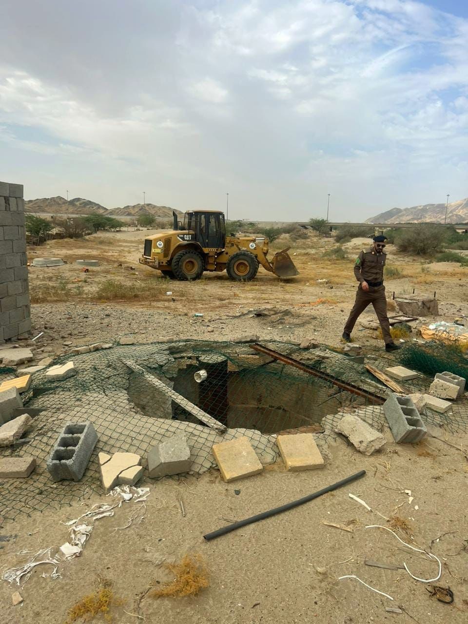 وفي التفاصيل اوضح مدير مكتب وزارة البيئة والمياه والزراعة بمحافظة الجموم المهندس رشاد الزهراني : انه ورد بلاغ من غرفة العمليات (911) عن بئر يدوية بعمق 12م ، وقطر 3م ، تشكل خطورة على المارة .