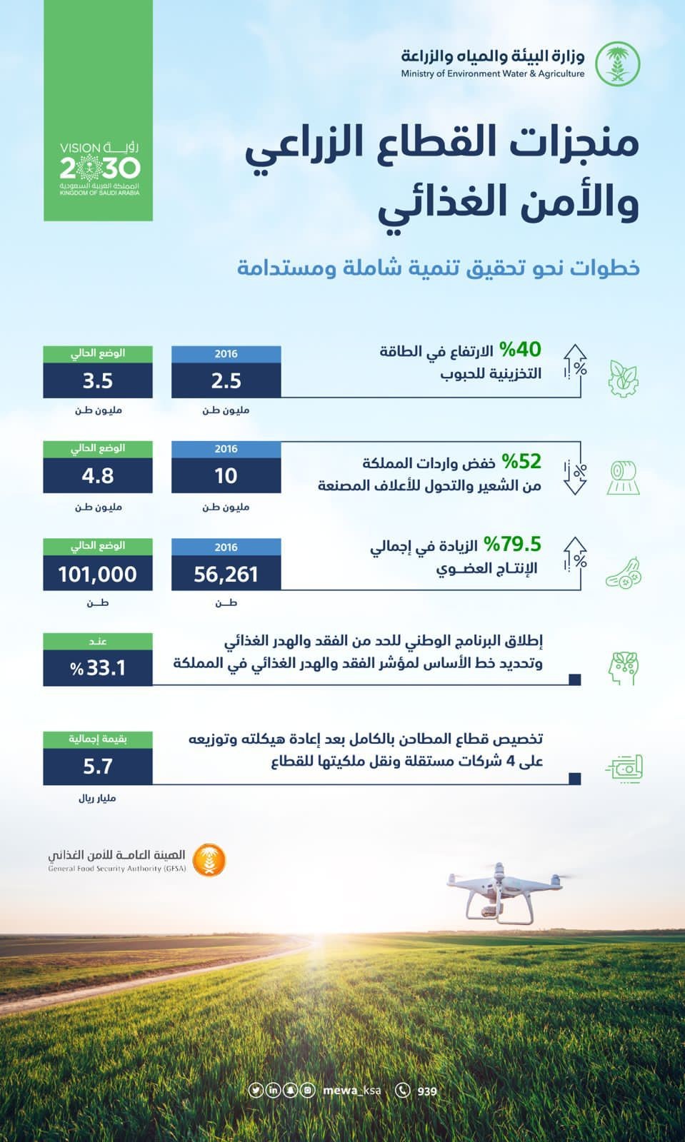 كشف تقريرٌ لوزارة البيئة والمياه والزراعة مؤخراً، عن تحقيق المنظومة منجزاتٍ وأرقامٍ قياسية في القطاع الزراعي، ضمن استراتيجياتها لتحقيق مستهدفات رؤية المملكة 2030، حيث أسهمت جهود الوزارة في تحقيق منجزاتٍ كان لها أثرها الواضح على القطاع الزراعي الذي حقق أعلى ناتجٍ محلي في تاريخ القطاع، مبينًا أن تحقيق الأمن الغذائي في المملكة يُعد من أولويات المنظومة التي تجد دعمًا لا محدود من قِبل القيادة الرشيدة.