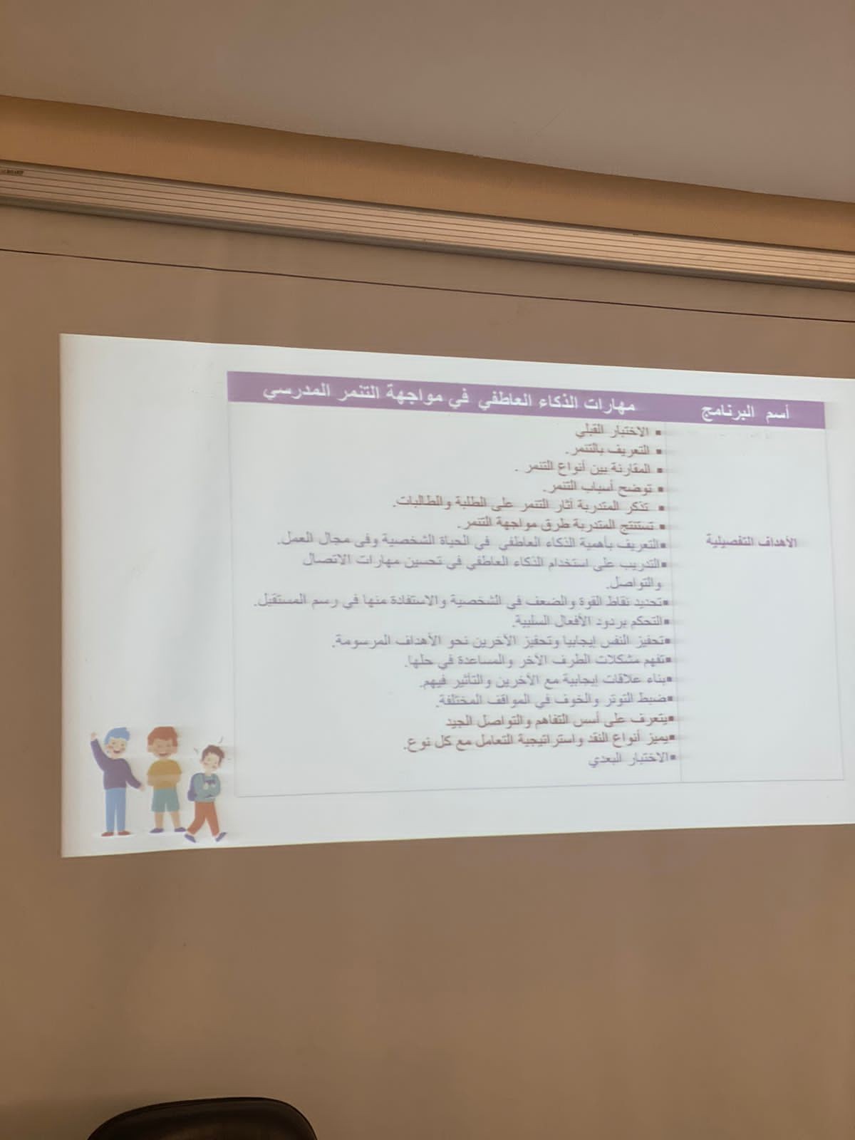 استهدف البرنامج ٢٥ موجهة طلابية وذلك بهدف إكساب المتدربات لمهارات الذكاء العاطفي ، والتعريف بالتنمر المدرسي وأنواعه ، وتعددالتنمر المدرسي ، واستنتاج طرق مواجهة التنمر .