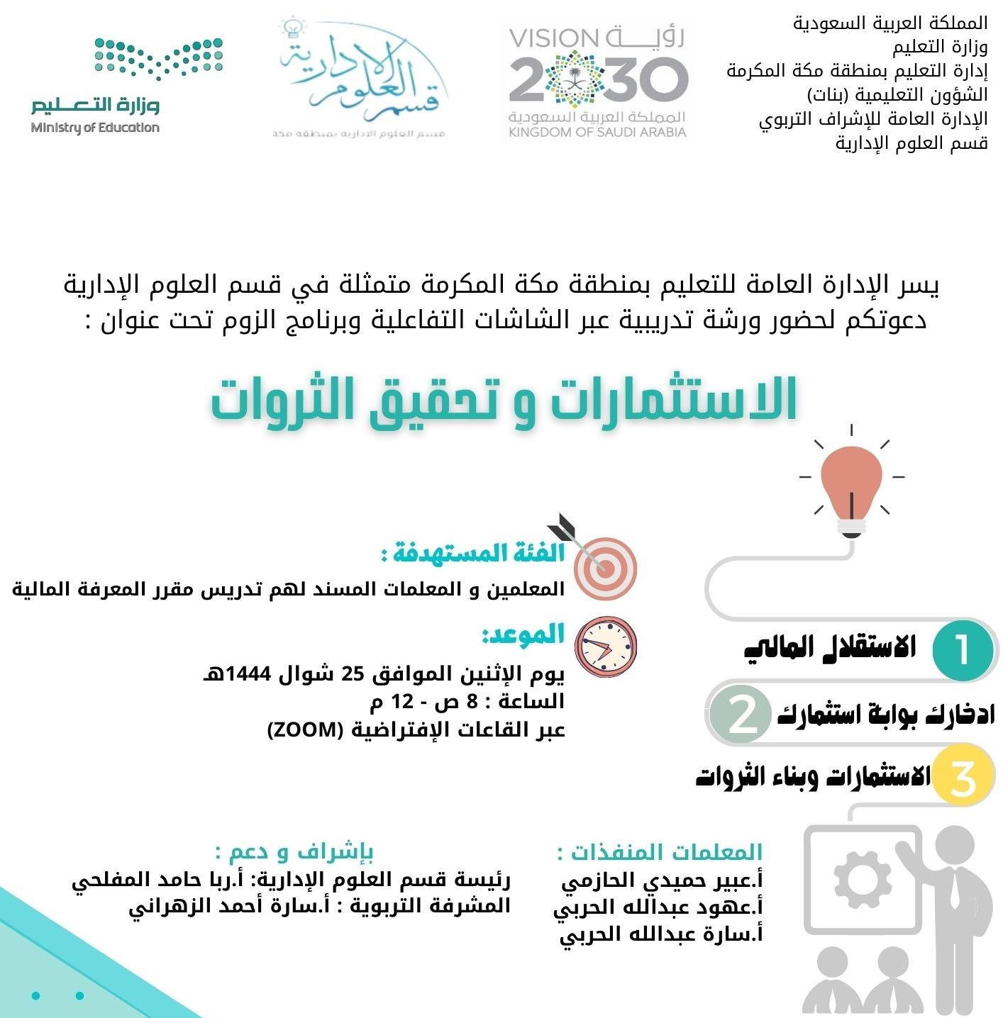 قسم العلوم الإدارية بتعليم مكة يشارك في الورشة التدريبية " الاستثمارات وتحقيق الثروات "
