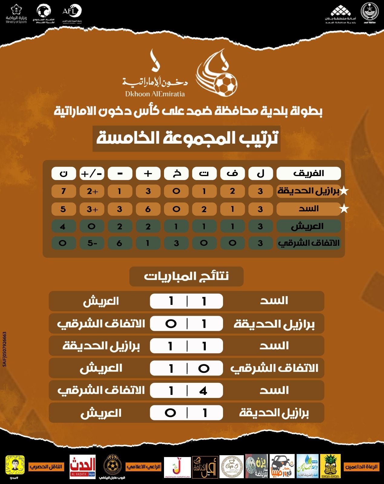 و في المجموعة الخامسة و برباعية مقابل هدف تجاوز السد الاتفاق الشرقي و حجز مقعداً في الدور الثاني بعد أن حل ثانياً خلف برازيل الحديقة الذي تفوق على العريش بهدف وحيد وتأهل كأول مجموعته .