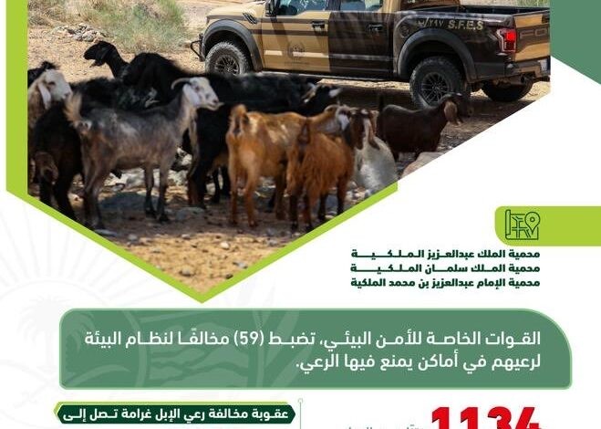 ضبطت القوات الخاصة للأمن البيئي 59 مخالفًا لنظام البيئة، 37 مواطنًا، و21 مقيمًا من الجنسية السودانية ومقيم من الجنسية الباكستانية، ارتكبوا مخالفات رعي 1134 متنًا من الإبل، و750 رأسًا من الأغنام في أماكن يمنع فيها الرعي في محمية الملك عبدالعزيز الملكية، ومحمية الإمام عبدالعزيز بن محمد الملكية، ومحمية الملك سلمان الملكية.