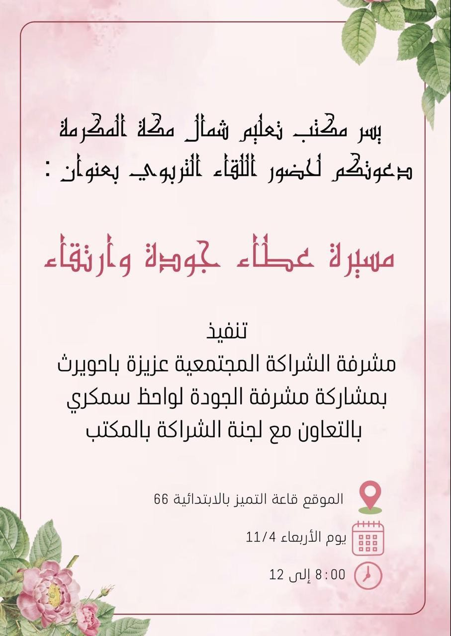 عقدت الإدارة العامة للتعليم بمنطقة مكة المكرمةممثلةً بمكتب تعليم شمال مكة يوم الأربعاء الموافق 4 / 11 / 1444هـ، لقاءً تربوياً بعنوان (مسيرة عطاء بجودة وارتقاء) وورشة عمل (بالهمة نصل للقمة) وذلك من قبل مشرفة الشراكة المجتمعية عزيزة باحويرث بمشاركة مشرفة الجودة لواحظ سمكري بحضور رئيسة الشؤون المدرسية نجاة الحازمي وعدد من الرائدات على مستوى مدارس مكتب الشمال وإشراف مديرة المكتب أنور السلمي.