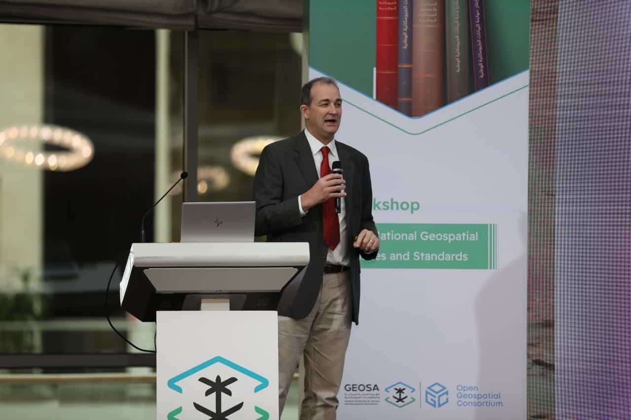 تلا ذلك كلمة لمساعد رئيس الهيئة العامة للمساحة والمعلومات الجيومكانية للمركز الجيومكاني الوطني المهندس عاصم الغامدي والذي سلط الضوء فيها على أهداف الورشة بشأن التعاون مع اتحاد المعلومات الجيومكانية المفتوحة – OGC، كما قدم كبير مستشارين رئيس الهيئة العامة للمساحة والمعلومات الجيومكانية الدكتور محمد ظفر ورقة عمل بعنوان ” مقدمة عن السياسات والمعايير الجيومكانية الوطنية.