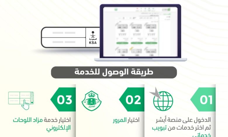 وأوضحت الإدارة في أنفوجرافيك لها طريقة الوصول للخدمة من خلال الدخول على منصة “أبشر” واختيار خدمات من تبويب خدماتي، ثم اختيار مرور، ومنها اختيار خدمة مزاد اللوحات الإلكتروني.