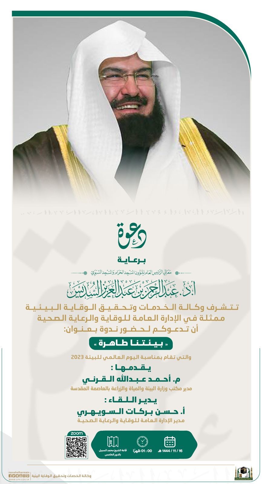 شارك مكتب وزارة البيئة والمياه والزراعة بالعاصمة المقدسة في اليوم العالمي للبيئة ٢٠٢٣ في ندوة بعنوان " بيئتنا طاهرة " بمقر الرئاسة العامة لشؤون المسجد الحرام والمسجد النبوي ، والتي إقامتها وكالة الخدمات وتحقيق الوقاية البيئية ممثلة في الإدارة العامة للوقاية والرعاية الصحية، وبرعاية معالي الرئيس العام لشؤون المسجد الحرام والمسجد النبوي الشيخ الدكتور عبد الرحمن بن عبد العزيز السديس.