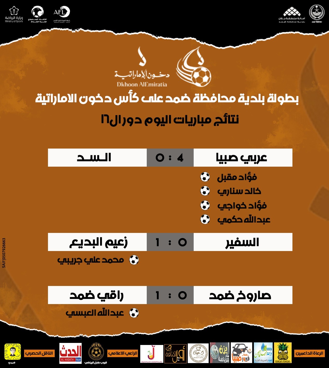 اختتمت مساء البارحة الاثنين مباريات دور الستة عشر من بطولة بلدية محافظة ضمد على كأس دخون الإماراتية بثلاث مباريات .
