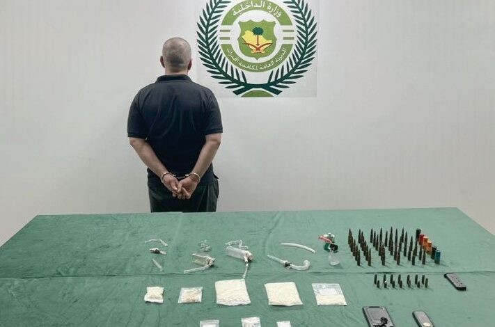 قبضت المديرية العامة لمكافحة المخدرات على مواطن بمنطقة تبوك لترويجه مادة الإمفيتامين المخدر ومادة الميثامفيتامين المخدر (الشبو) ومادة الحشيش المخدر، وضبط بحوزته ذخيرة حية، وجرى إيقافه واتخاذ الإجراءات النظامية بحقه، وإحالته إلى النيابة العامة.