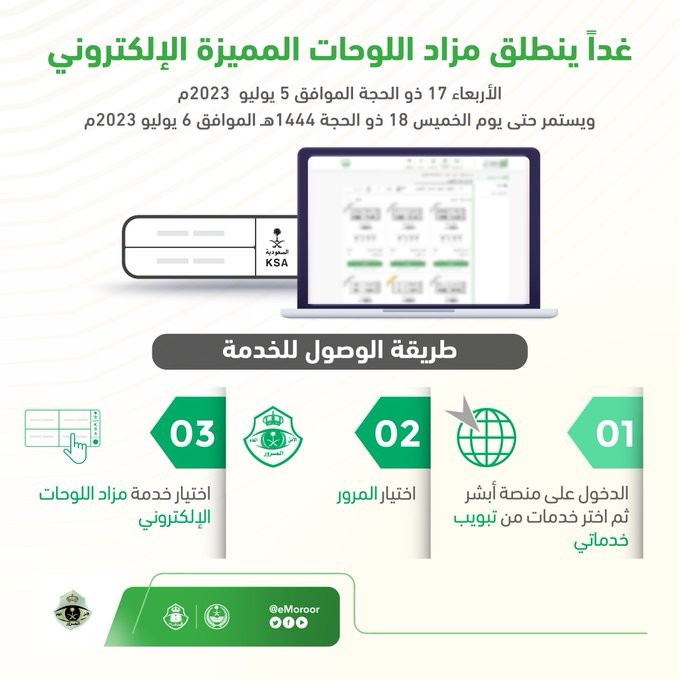 اعلنت الإدارة العامة للمرور عن طرح مزاد اللوحات الإلكتروني غدًا الأربعاء، 1444/12/17 هـ الموافق 2023/07/5 م وذلك عبر منصة #أبشر التي تمكّن الراغبين في شراء اللوحات المميزة من المشاركة في المزاد إلكترونياً.