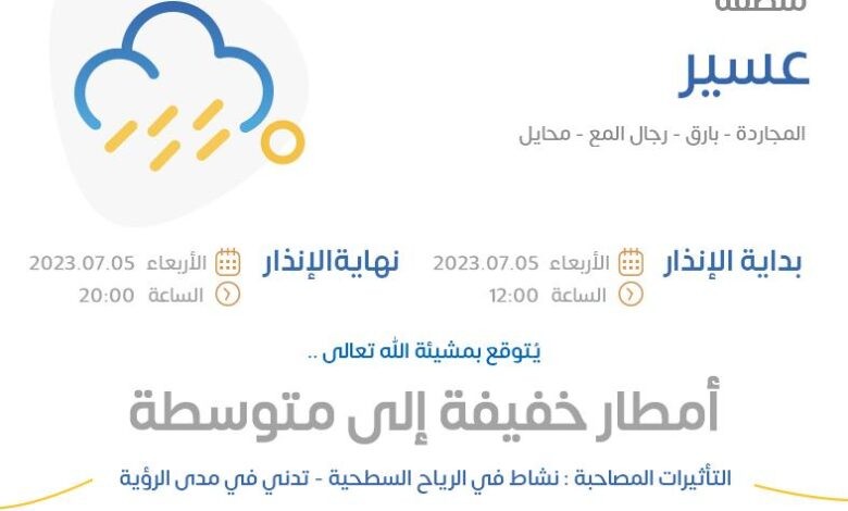 الأرصاد: هطول أمطار خفيفة إلى متوسطة على منطقة عسير