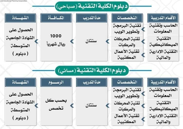 تعلن الكلية التقنية بالليث عن مواعيد التسجيل والقبول في الدبلومات التدريبية الصباحية والمسائية بمختلف التخصصات للفصل التدريبي الأول للعام ١٤٤٥هـ إذ تتيح الكلية التقنية بالليث العديد من الدبلومات بتخصصات مختلفة ومتنوعة بحيث يحصل المتدرب على الشهادة الجامعية المتوسطة (دبلوم) عند إنهائه فترة التدريب(سنتان) وبمكافأة شهرية قدرها( ١٠٠٠) ريال.