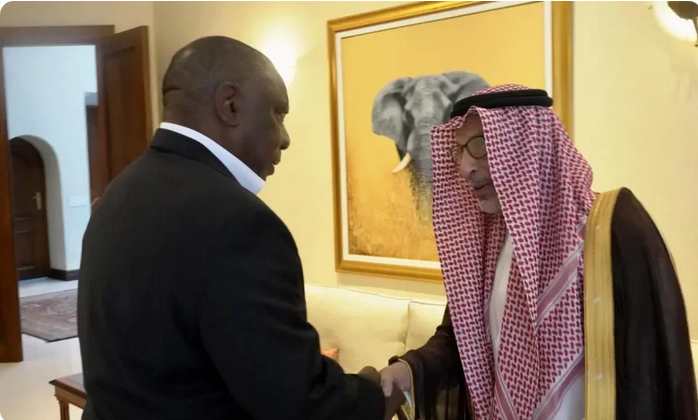 ونقل معالي المستشار خلال الاستقبال، تحيات خادم الحرمين الشريفين الملك سلمان بن عبدالعزيز آل سعود، وصاحب السمو الملكي الأمير محمد بن سلمان بن عبدالعزيز آل سعود، ولي العهد رئيس مجلس الوزراء – حفظهما الله – لفخامته ولحكومة وشعب جمهورية جنوب أفريقيا الصديق، فيما حمله فخامته تحياته وتقديره لخادم الحرمين الشريفين، وسمو ولي العهد، وحكومة وشعب المملكة العربية السعودية.