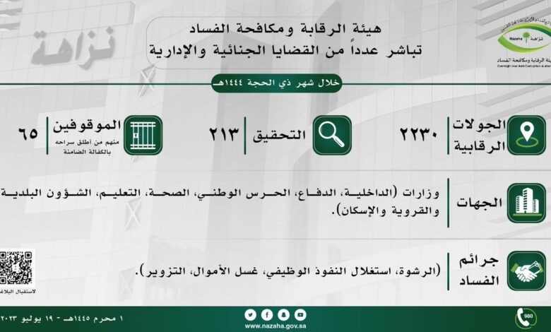 باشرت هيئة الرقابة ومكافحة الفساد عدداً من القضايا الجنائية والإدارية خلال شهر ذي الحجة 1444 هـ.