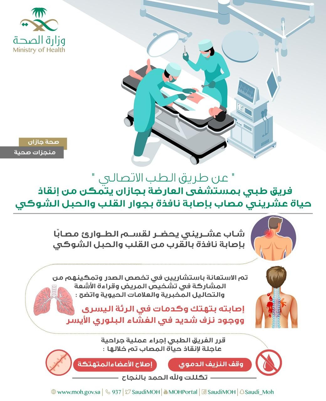 وفي  التفاصيل  ذكر  صحة  جازان  بأن  المصاب  حضر لقسم  الطوارئ  وكان  يعاني  من  إصابة  نافذة  في الصدر  بالقرب  من  القلب  والحبل الشوكي.
