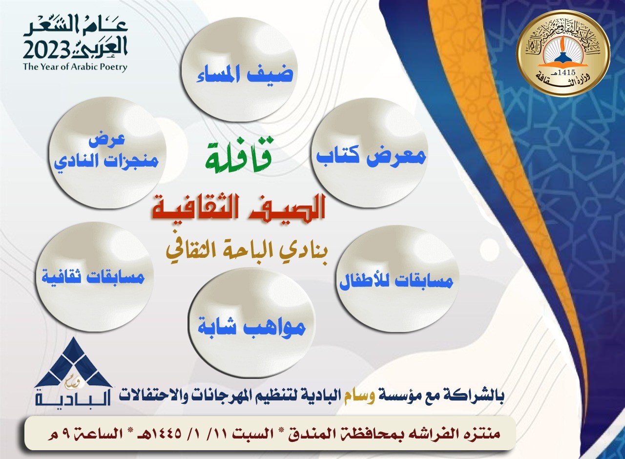 تنطلق قافلة نادي الباحة الأدبي الثقافي الصيفية مساء السبت الموافق١١ محرم ١٤٤٥هـ بمنتزه ( الفراشة ) بمحافظة المندق وذلك بهدف بالشراكة مع مؤسسة ( وسام البادية ).