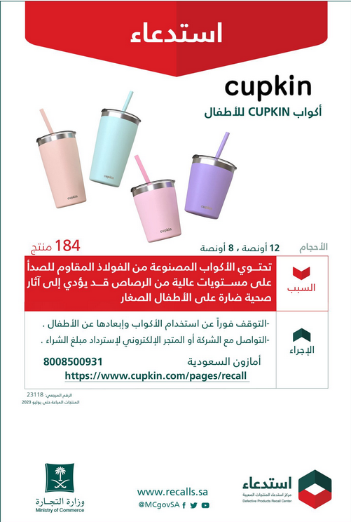 أعلنت وزارة التجارة، عن استدعاء 184 كوب (cupkin) للأطفال من أحجام: (12 أونصة/ 8 أونصة).