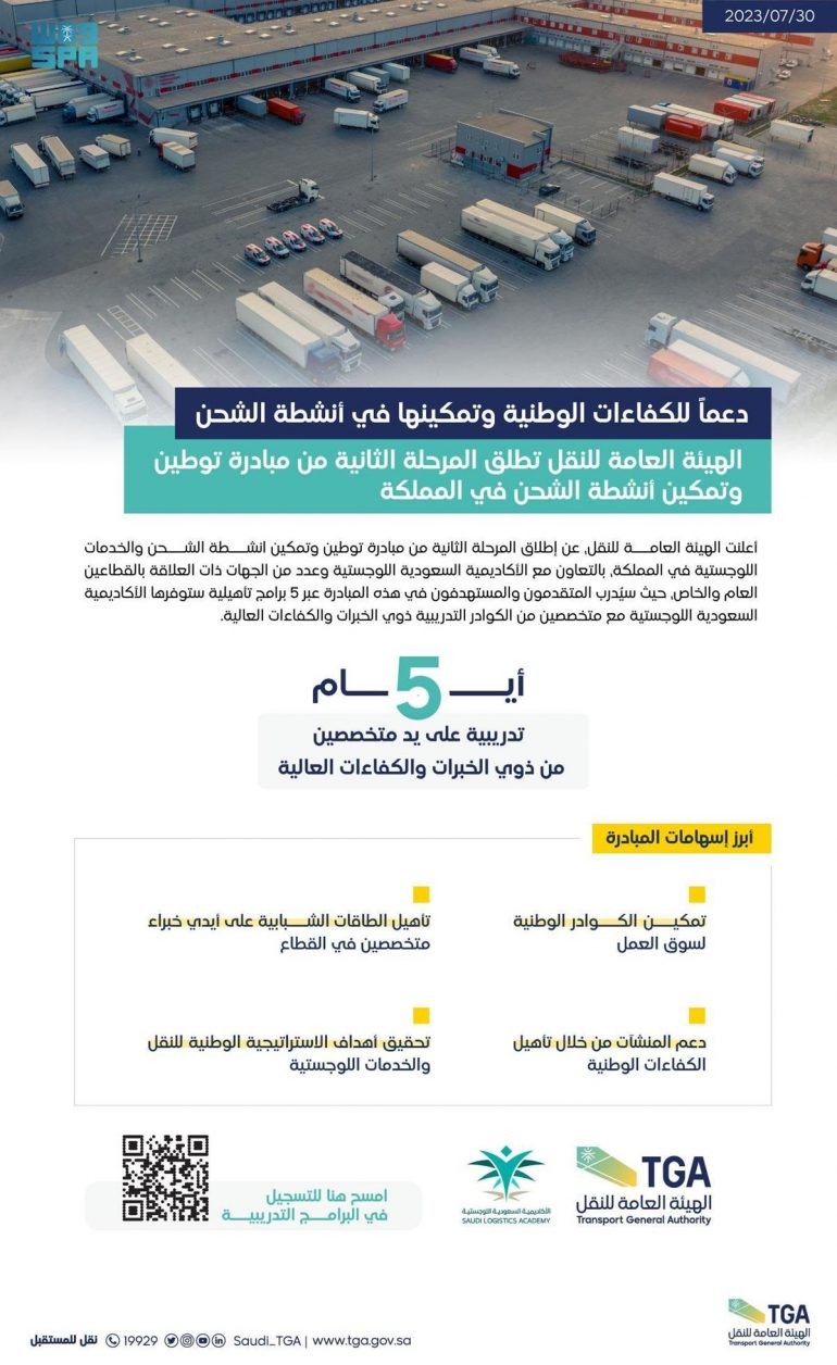وأوضحت الهيئة أن المتقدمين والمستهدفين في هذه المبادرة سيتدربون عبر 5 برامج تأهيلية ستوفرها الأكاديمية السعودية اللوجستية مع متخصصين من الكوادر التدريبية ذوي الخبرات والكفاءات العالية.