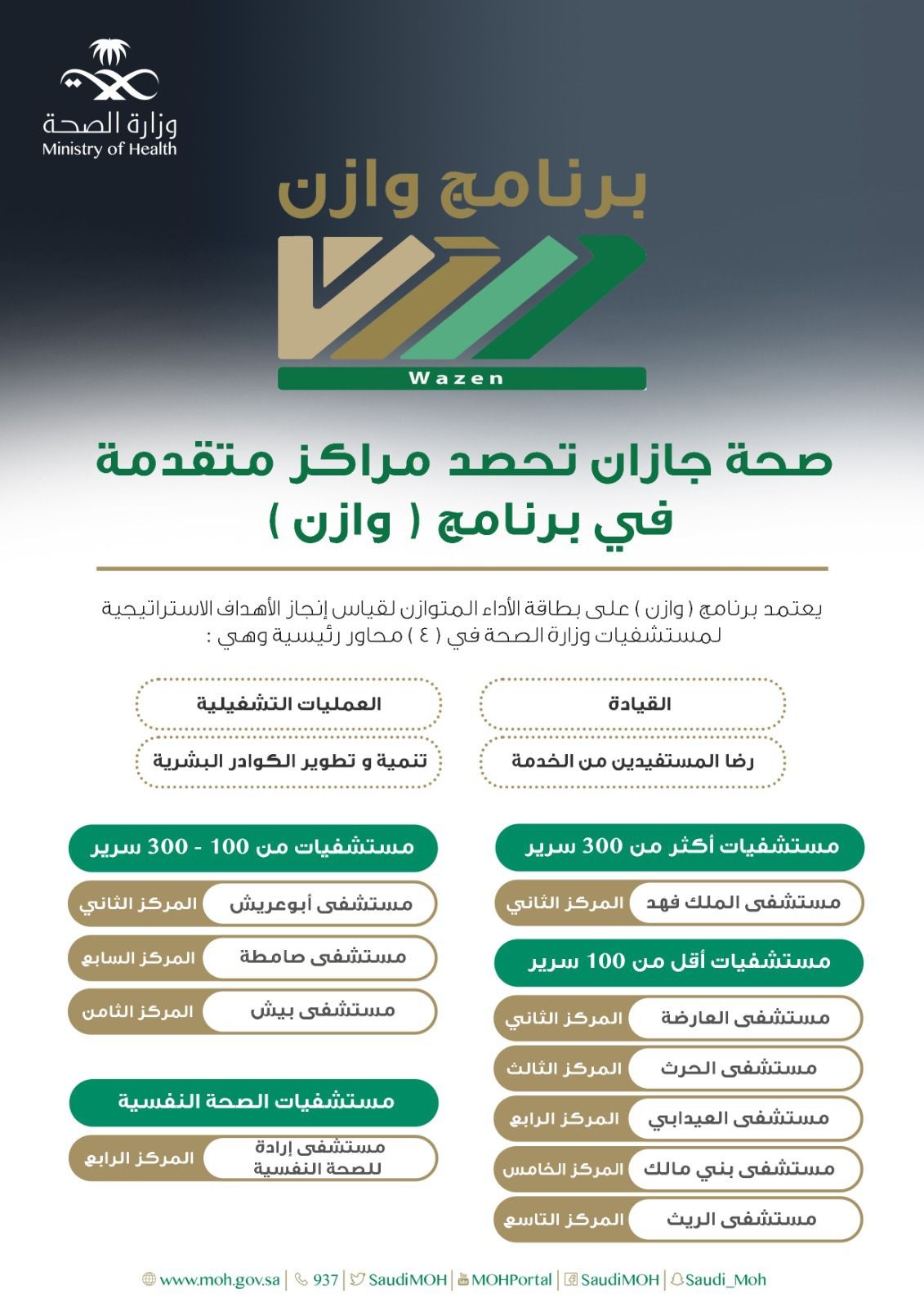 حصدت 10 مستشفيات من صحة جازان مراكز متقدمة في برنامج " وزان " على مستشفيات وزارة الصحة وذلك وفق التقرير الصادر عن الربع الاول من هذا العام ٢٠٢٣ م