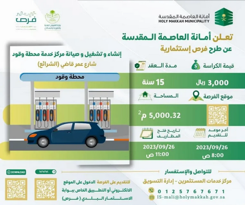 أعلنت أمانة العاصمة المقدسة، عن طرح فرصة استثمارية؛ لإنشاء وتشغيل وصيانة مركز خدمة محطة وقود بشارع عمر قاضي بحي الشرائع بمكة المكرمة.