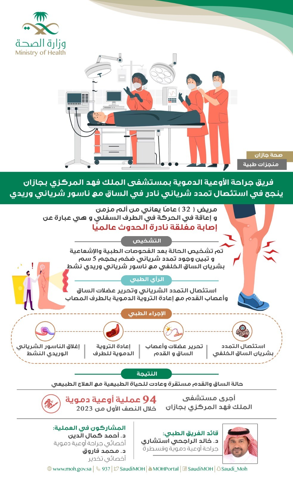 وفي التفاصيل ذكر قائد الفريق الطبي الدكتور خالد الراجحي استشاري جراحة الأوعية الدموية والقسطرة بأن المريض الذي يبلغ من العمر 32 عامًا كان يعاني من ألم مزمن و إعاقة في الحركة في الطرف السفلي و هي عبارة عن إصابة مغلقة نادرة الحدوث عالميًا .