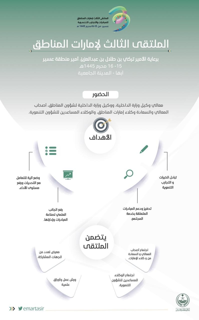 يرعى الأمير تركي بن طلال بن عبدالعزيز، أمير منطقة عسير، غدًا (الأربعاء 15/ 1/ 1445 هـ لموافق 2/ 8/ 2023 م)، إنطلاق فعاليات الملتقى الثالث لإمارات المناطق للمبادرات والتجارب التنموية، الذي تستضيفه منطقة عسير لمدة يومين، بمقر المدينة الجامعية بالقرعا، بحضور معالي وكيل وزارة الداخلية الدكتور هشام بن عبدالرحمن الفالح، ووكيل وزارة الداخلية لشؤون المناطق المهندس عبدالله بن عبدالرحمن الربيعة، وأصحاب المعالي والسعادة وكلاء إمارات المناطق والوكلاء المساعدين للشؤون التنموية.