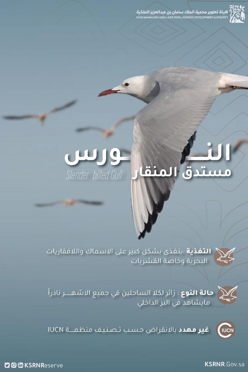 رصدت هيئة تطوير محمية الملك سلمان بن عبدالعزيز الملكية نوعين جديدين من الطيور داخل أراضي المحمية، الأول هو طائر النورس من نوع مستدق المنقار (Larus genei) Slender-billed Gull ، وهذا النوع يعتبر نادراً ما يُشاهد في الأماكن الصحراوية، ويشاهد بكثرة في المناطق الساحلية وخصوصاً في فصل الشتاء، والنوع الآخر الذي تم رصده هو طائر النحام الكبير Greater Flamingo (Phoenicopterus roseus) ، وسجل هذا النوع في المملكة بشكل عام  كمهاجر متكاثر وعابر، ويعتبر من الطيور الزائرة شتوياً خصوصاً على السواحل الشرقية والغربية إضافة إلى المنطقة الوسطى بسبب مرحلة الانتقال بين السواحل.