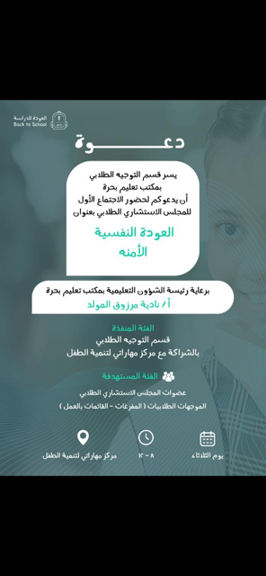 نفذت الإدارة العامة للتعليم بمنطقة مكة المكرمة ممثلة في مكتب تعليم بحرة لقاء بعنوان العودة النفسية الآمنة وذلك يوم الثلاثاء 28 -1-1445هـ بمركز التدريب السادس بمكتب التعليم ببحرة، نفذه مشرفة التوجيه الطلابي رانيا البشري بمساندة مركز مهاراتي لتنمية الطفل استهدف عضوات المجلس الاستشاري الطلابي والموجهات الطلابيات القائمات بالعمل وذلك بهدف تطوير العملية الأكاديمية من خلال الطالبات والشراكة مع أولياء الأمور من خلال الخدمات الإرشادية وبناء شخصية الطالبة المتكاملة وتنميتها وطنياً واجتماعياً مع التوعية والاهتمام بقضايا الطالبات.