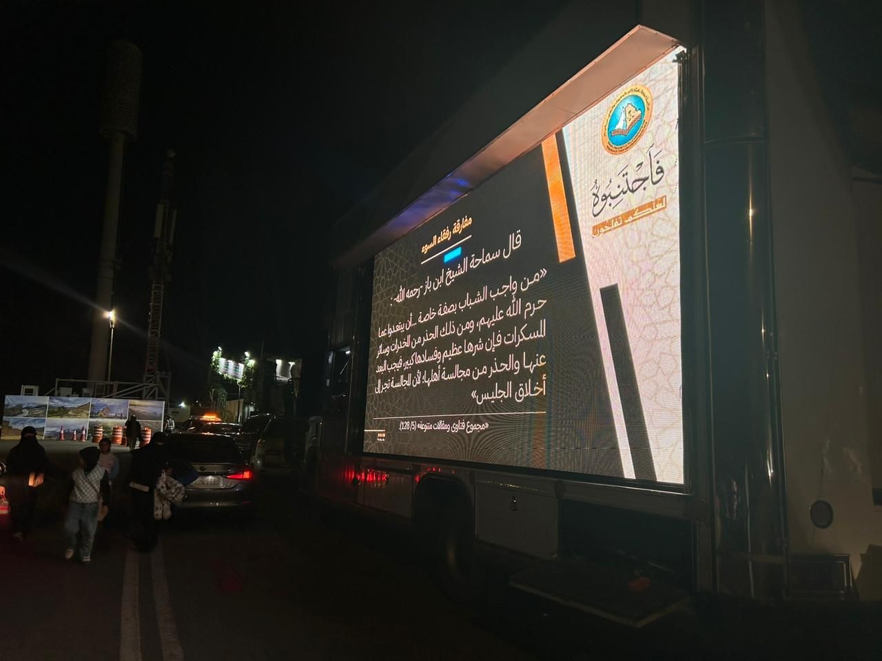 وتحتوي المنصة على شاشة للعرض عالية الدقة، تعرض مجموعة متنوعة من المواد التوعوية والتثقيفية، بما في ذلك عدة أفلام مرئية تشمل نشر القيم والأخلاق الإسلامية، والتوعية بمخاطر المخدرات والمسكرات والتحذير منها، وتعزيز المواطنة الصالحة، والحفاظ على مقدرات الوطن.