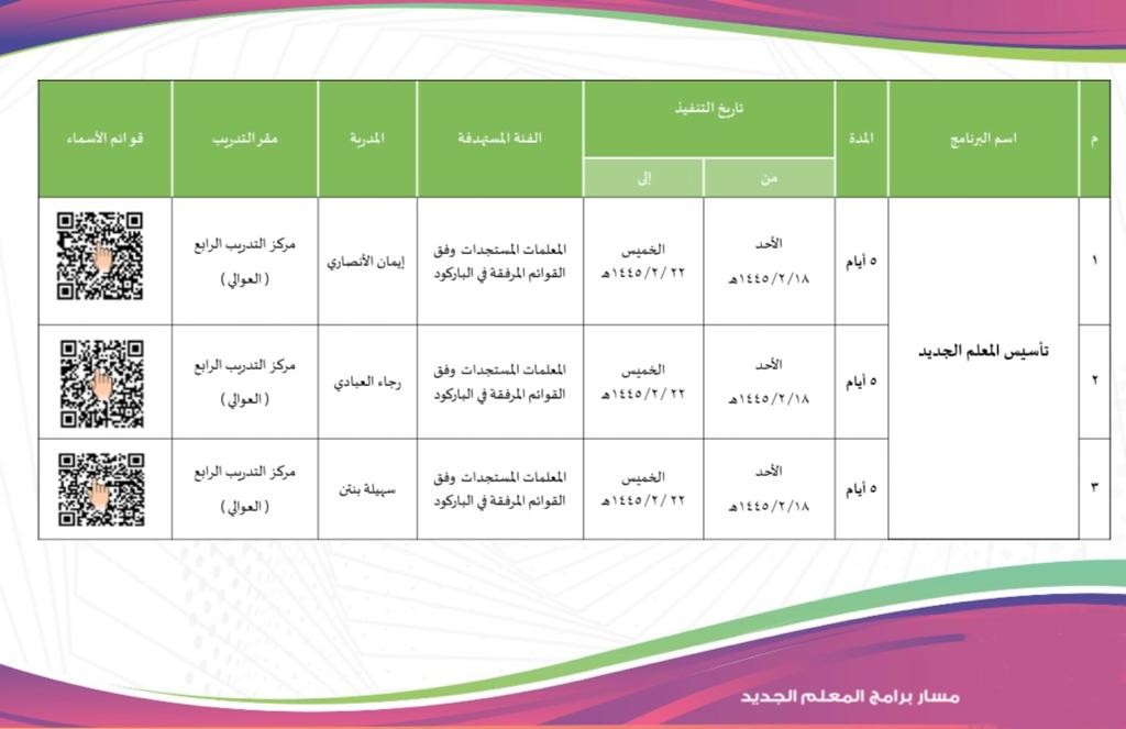 أطلقت الإدارة العامة للتعليم بمنطقة مكة المكرمة ممثلةً في إدارة التدريب والابتعاث من اليوم الأحد الموافق 18/2 /1445هـ وحتى 29/2/1445هـ ، خطة مسار المعلم الجديد للعام الدراسي 1445هـ وذلك بواقع 11 برنامج تدريبي، 9 منها حضوريا في قاعات تدريبية مجهزة بشكل متكامل بكل الوسائل والأدوات الخاصة بالتدريب ، و2 منها عن بعد وفق أفضل الممارسات التدريبية الإلكترونية الحديثة ؛ وذلك انطلاقًا من حرص الإدارة العامة بتعليم مكة المكرمة على الإسهام في تحقيق الجهود المتواصلة التي تبذلها وزارة التعليم بالمملكة العربية السعودية من أجل تحقيق مستهدفات المملكة لرؤية سنة 2030، واستغلال الموارد البشرية بشكل أفضل والعمل على إيجاد البرامج المهنية التي تساهم في تحضير المعلم الجديد وتعريفه بكل الأنظمة واللوائح والمسؤوليات المتعلقة بالعمل وأخلاقيات المهنية ومختلف البيئات التعليمية.