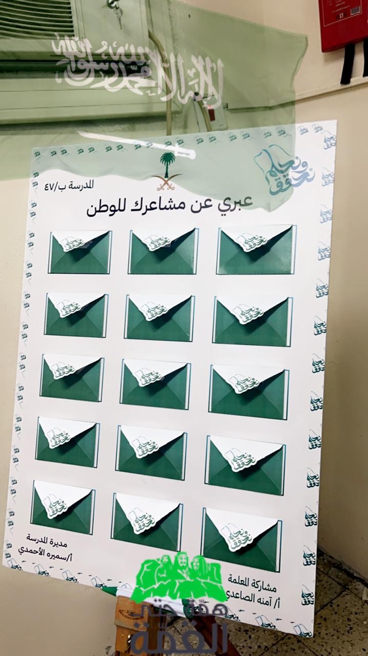 نفذت الابتدائية السابعة والأربعون التابعة لمكتب تعليم التنعيم بالإدارة العامة للتعليم بمنطقة مكة المكرمة يوم الخميس الموافق 13/ 3 / 14454 هـ برنامجًا للاحتفاء باليوم الوطني الـ 93 ، نفذته رائدة النشاط أماني الصاعدي بالتعاون مع المعلمات بمتابعة من قبل مديرة المدرسة سميرة الأحمدي وذلك تحت إشراف مديرة المكتب أفراح الوافي.
