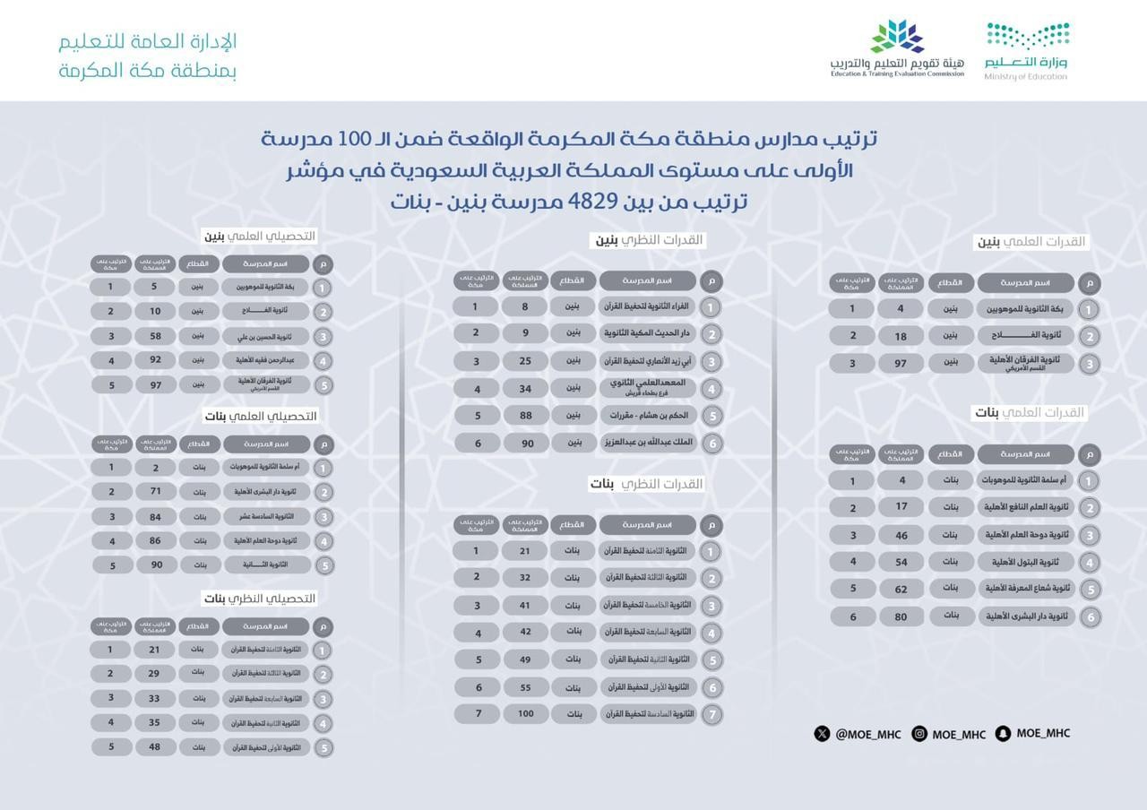 حققت 28 مدرسة من مدارس الإدارة العامة للتعليم بمنطقة مكة المكرمة مراكز متقدمة بين أعلى 100 مدرسة على مستوى المملكة وذلك ضمن مؤشر ترتيب "هيئة تقويم التعليم والتدريب" في الاختبار التحصيلي والقدرات من بين 4829 مدرسة بنين – بنات ، حيث أظهرت نتائج اختبار القدرات العلمي لمدارس البنين - الحكومية، والأهلية - حصول مدرسة بكة الثانوية للموهوبين على الترتيب الرابع على مستوى المملكة والأول على مستوى تعليم مكة ، فيما حلت ثانوية الفلاح في الترتيب الثامن عشر على مستوى المملكة و الترتيب الثاني على مستوى تعليم مكة ، وثانوية الفرقان الأهلية " القسم الأمريكي " على الترتيب السابع والتسعين على مستوى المملكة والترتيب الثالث على مستوى تعليم مكة ، فيما أظهرت مدارس البنات – الحكومية والأهلية – في اختبار القدرات العلمي حصول مدرسة أم سلمة الثانوية للموهوبات الترتيب الرابع على مستوى المملكة والترتيب الأول على مستوى تعليم مكة ، وثانوية العلم النافع الأهلية الترتيب السابع عشر على مستوى المملكة والترتيب الثاني على مستوى تعليم مكة ، وثانوية دوحة العلم الأهلية الترتيب السادس والأربعين على مستوى المملكة والترتيب الثالث على مستوى تعليم مكة ، وثانوية البتول الأهلية على الترتيب الرابع والخمسين على مستوى المملكة والترتيب الرابع على مستوى تعليم مكة ، وثانوية شعاع المعرفة الأهلية على الترتيب الثاني والستين على مستوى المملكة والترتيب الخامس على مستوى تعليم مكة ، وثانوية دار البشرى الأهلية على الترتيب الثمانين على مستوى المملكة والترتيب السادس على مستوى تعليم مكة