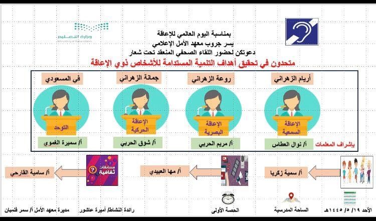 احتفى معهد الأمل التابع لمكتب تعليم التنعيم بالإدارة العامة للتعليم بمنطقة مكة المكرمة يوم الأحد 19/5/1445هـ باليوم العالمي للإعاقة.