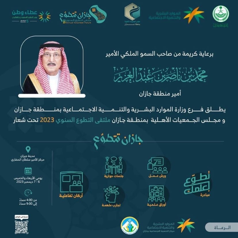 برعاية كريمة من صاحب السمو الملكي الأمير محمد بن ناصر بن عبدالعزيز أمير منطقة جازان يُطلق غداً فرع وزارة الموارد البشرية والتنمية الاجتماعية بمنطقة جازان ومجلس الجمعيات الأهلية بالمنطقة ملتقى "التطوع السنوي 2023" تحت شعار (جازان تتطوع)على مدار يومي الأربعاء والخميس بمدينة جيزان بمركز الأمير سلطان الحضاري.