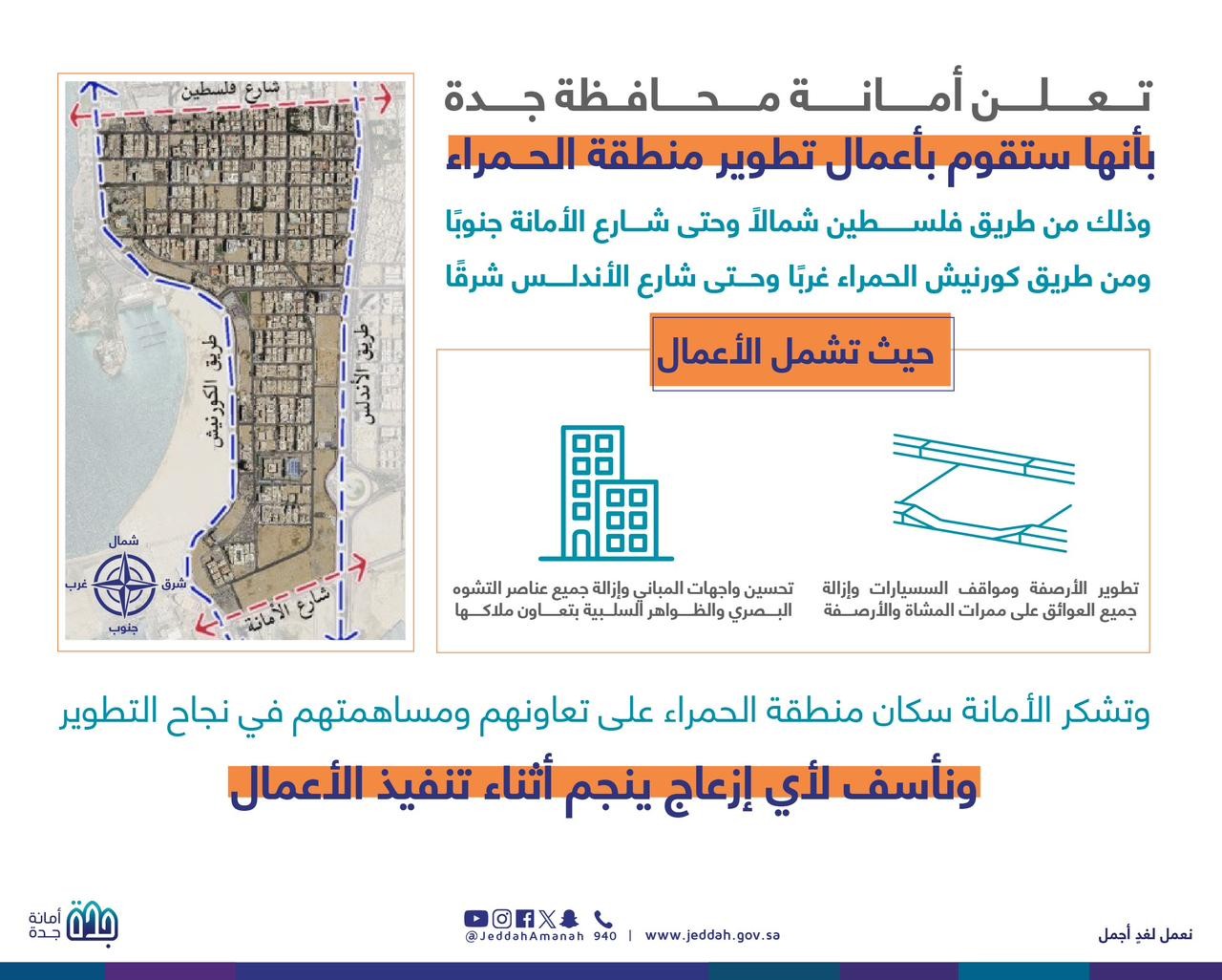 أعلنت أمانة محافظة جدة عن بدء تنفيذ أعمال التطوير بمنطقة الحمراء، وذلك من طريق فلسطين شمالًا وحتى شارع الأمانة جنوبًا، ومن طريق كورنيش الحمراء غربًا وحتى شارع الأندلس شرقًا.