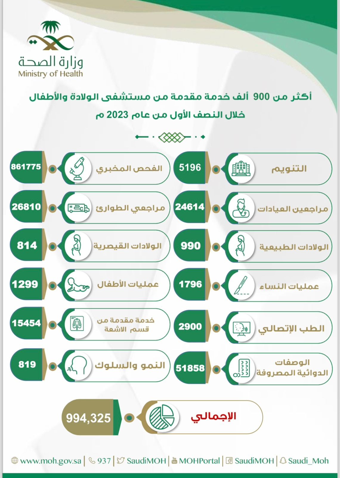 قدّم مستشفى الولادة والأطفال بمحافظة بيشة خدماته العلاجية 900 ألف من مختلف الأقسام ، وذلك خلال النصف الأول من عام2023م