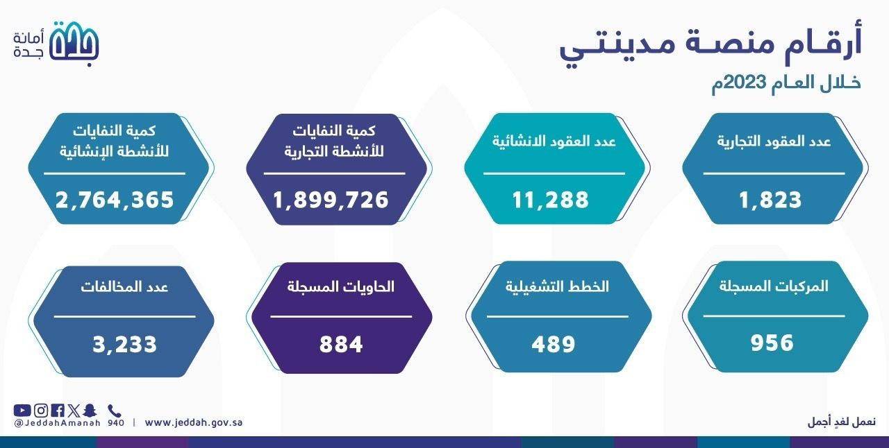 وكشف تقرير صادر عن مركز مدينتي بالأمانة عن العام 2023م عن إجمالي النفايات التي تراقب المنصة حركة جمعها ونقلها الكترونياً والمقدرة بأكثر من ( 1,899,726)طن من النفايات البلدية التجارية و(2,764,365) طن من مخلفات البناء والهدم والترميم ونواتج الحفريات فيما تجاوز إجمالي الحاويات المراقبة حاجز الـ (24,460) حاوية نفايات، بالإضافة لتسجيل (3) مزودين لخدمات التتبع جرى ربطها بالمنصة مباشرة والتي تعمل على تتبع أكثر من (9,138) مركبة متحركة على شوارع المدينة كما رصدت المنصة (3,233) مخالفة.