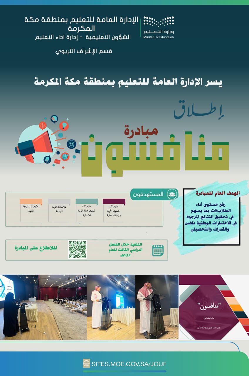 أطلقت الإدارة العامة للتعليم بمكة المكرمة ممثلة بإدارة الأداء التعليمي، قسم الإشراف التربوي يطلق مبادرة " منافسون" التي تستهدف 60 ألف طالب وطالبة، بهدف رفع مستوى أداء الطلاب والطالبات بما يسهم في تحقيق النتائج المرجوة في الاختبارات الوطنية نافس والقدرات والتحصيلي وتحسين وتجويد ممارسات عمليات التعليم والتعلم في المواد المستهدفة وتهيئة طلاب وطالبات التعليم لأداء الاختبارات الوطنية وتجويد نواتج ومخرجات عمليات التعليم والتعلم لدى الفئة المستفيدة لتحقيق المستهدفات الوطنية.