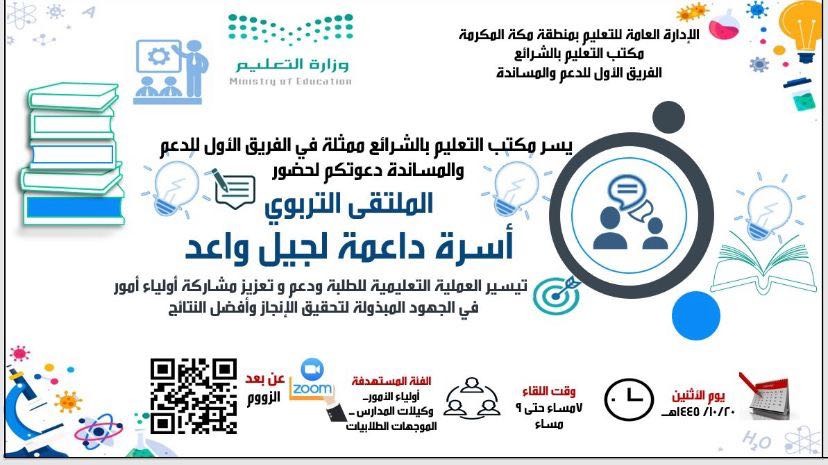 عقدت الإدارة العامة للتعليم بمنطقة مكة المكرمة ممثلة في مكتب تعليم الشرائع ملتقى ( أسرة داعمة لجيل واعد )  يوم الاثنين الموافق 20 / 10 / 1445هـ، نفذه الفريق الاشراقي الاول للدعم والمساندة بمكتب الشرائع ( بنات ) ممثلا في كلٍ من : فاطمة الدوسري ، رفيعة القثامي ،مريم الصاعدي ، نادية الحسن ، نجاة الحربي ، والمعلمة عبرا المنتشري عن بعد عبر الزوم .