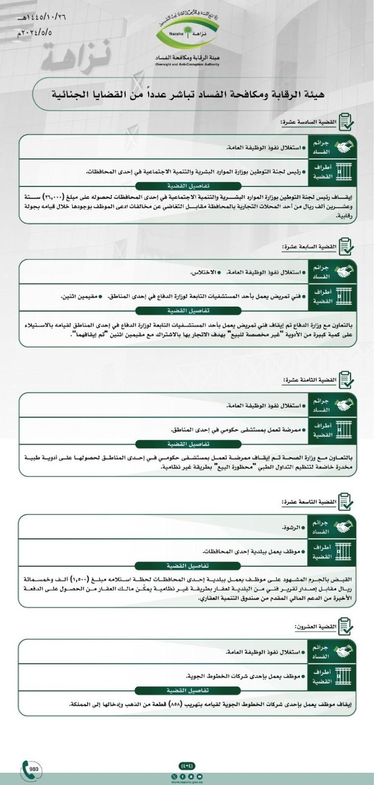 صرّح المتحدث الرسمي في هيئة الرقابة ومكافحة الفساد بأن الهيئة باشرت عدداً من القضايا الجنائية خلال الفترة الماضية، وجارٍ استكمال الإجراءات النظامية بحق مرتكبيها، وكانت