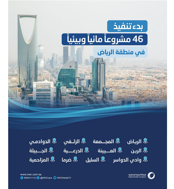 بدأت شركة المياه الوطنية، مُمَثلةً بالقطاع الأوسط في تنفيذ (46) مشروعًا للمياه والصرف الصحي في منطقة الرياض، وبأطوال خطوط وشبكات بلغت أكثر من (2,900) كلم، وبتكلفة إجمالية تجاوزت مليارٍ و(600) مليون ريال؛ وذلك ضمن جهودها المستمرة في تنفيذ خططها الإستراتيجية لتهيئة البنى التحتية في كلٍ من قطاعي المياه والخدمات البيئية، واستنادًا إلى مبادراتها المُعدة لرفع نسب تغطيتها بالخدمات التي تقدمها لعملائها.