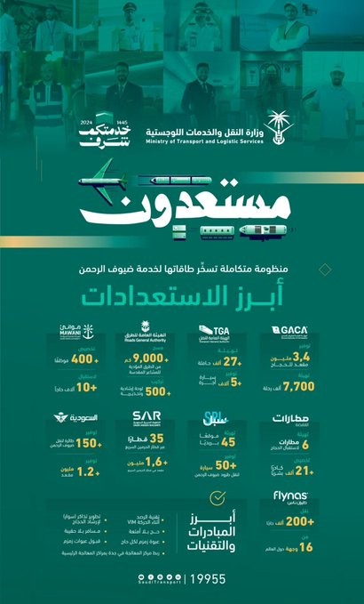 وكانت منظومة النقل والخدمات اللوجستية قد أعلنت جاهزيتَها لاستقبال حجاج بيت الله الحرام لموسم حج 1445هـ، مشيرةً إلى توفير خدمات متكاملة عبر مختلف جهاتها؛ حيث تؤدّي تلك الجهاتُ دورًا حيويًّا في تقديم الخدمات اللوجستية وتوفير جميع احتياجات ضيوف الرحمن برًّا وبحرًا وجوًّا.