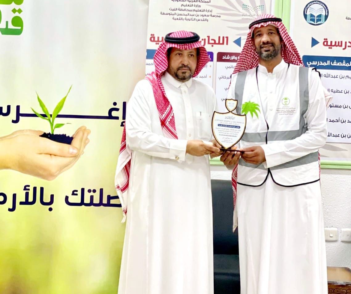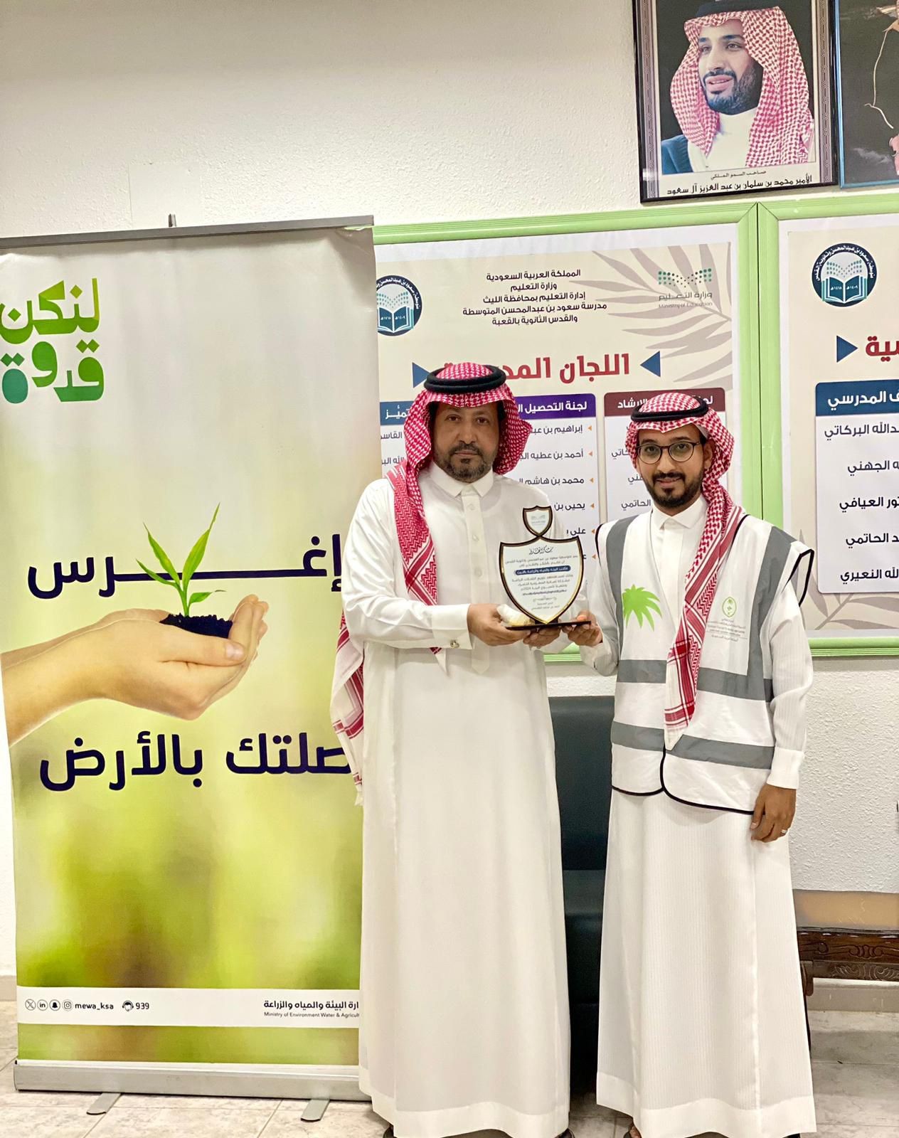 يذكر أن مدير المدرسة قدم درع وشهادة شكر وتقدير لمكتب وزارة البيئة والمياه والزراعة على ما يقومون به من جهود في مبادرة السعودية الخضراء .
