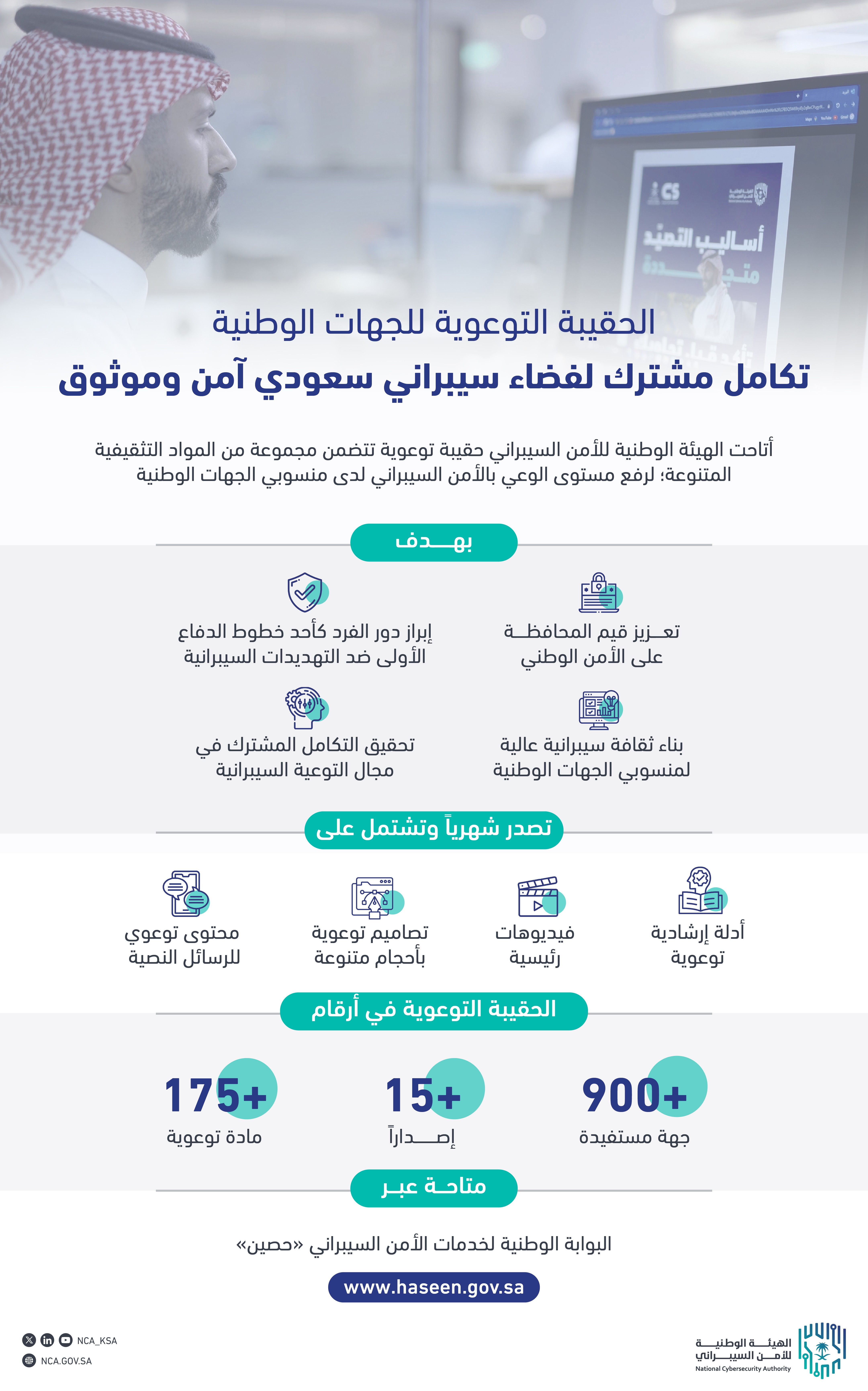 الهيئة الوطنية للأمن السيبراني: أكثر من 900 جهة مستفيدة من «الحقيبة التوعوية للجهات الوطنية»