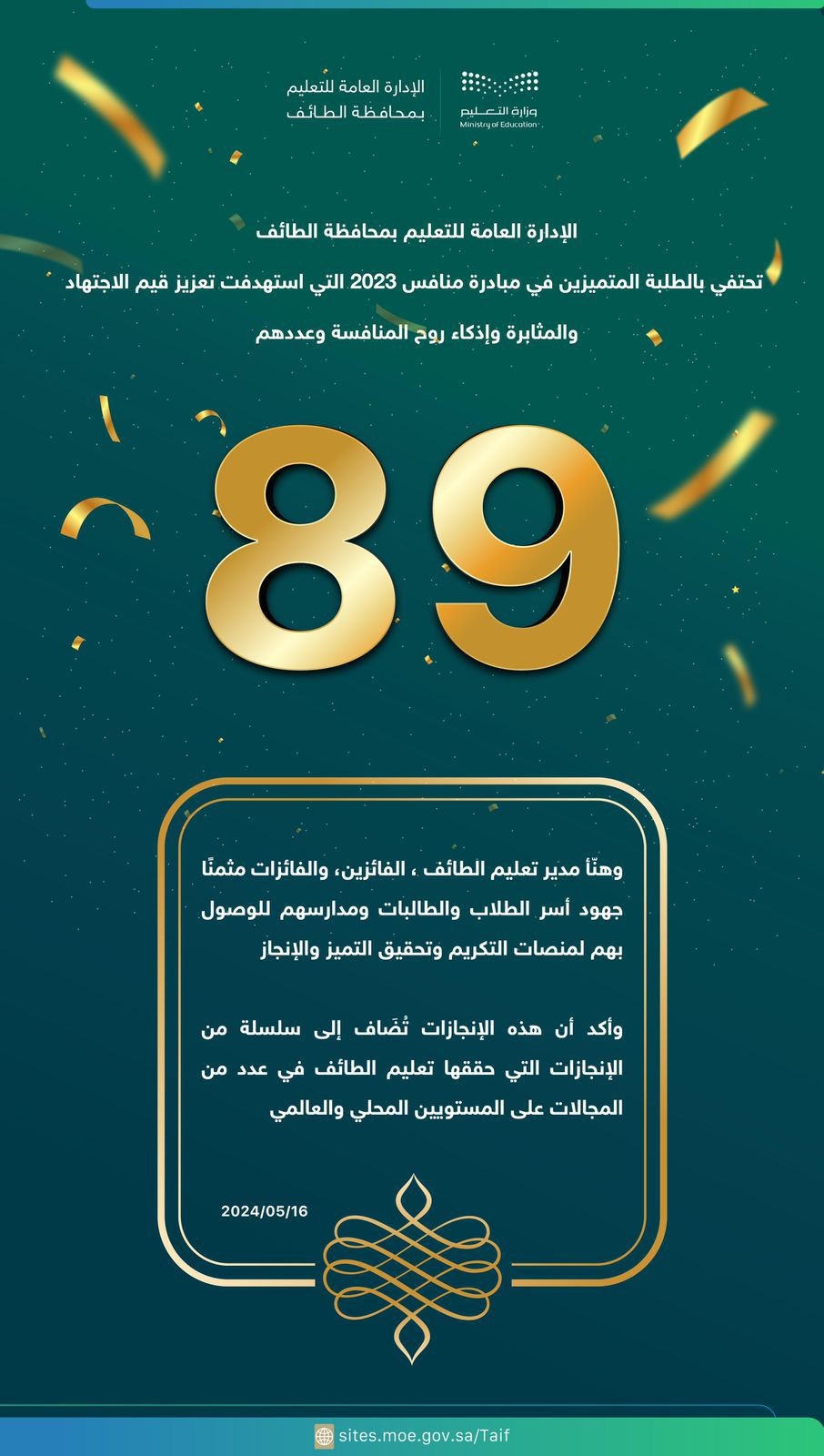 احتفت الإدارة العامة للتعليم بالطائف اليوم، بالطلاب والطالبات المتميزين في مبادرة "منافس" على مستوى المدارس ومكاتب التعليم، وعددهم 89 طالباً وطالبة والتي تأتي لتعزيز قيم الاجتهاد والمثابرة وإذكاء روح المنافسة بين الطلبة في جميع المجالات، وبما يعمل على تحسين مخرجات التعليم الأساسية.