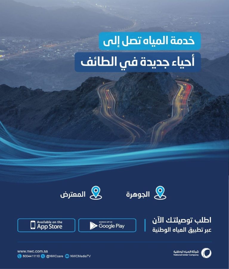 وأكدت أن هذه المشاريع تأتي في إطار جهودها لتعزيز منظومة الخدمات المائية، ورفع الكفاءة التشغيلية، وتوسيع دائرة الأحياء المخدومة بشبكات المياه في محافظة الطائف، داعية سكان أحياء (المعترض، والجوهرة) بالتقدم لطلب الخدمة من خلال تطبيقها الإلكتروني على الهواتف الذكية، أو فرعها الإلكتروني (e.nwc.com.sa).